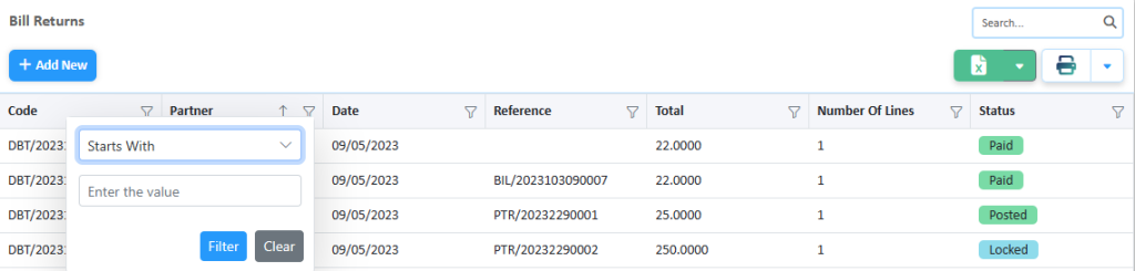 The Bill Return page allows you to create and manage the return of bills. Here’s how to create a new bill return: