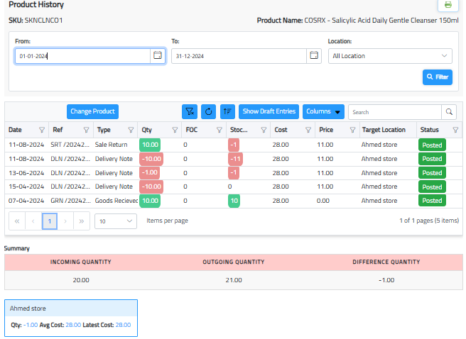 The Product History button displays all transactions for this particular product, including Incoming Quantity, Outgoing Quantity, and Difference Quantity.