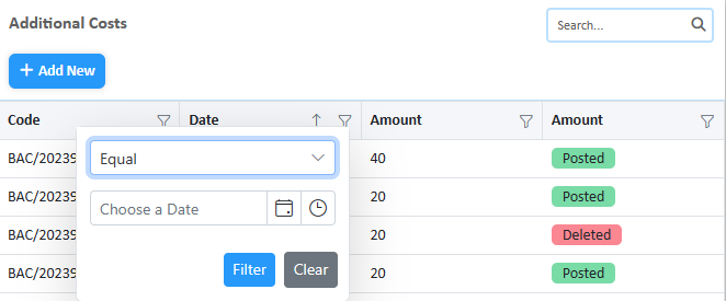 Filtering: Click on the filter icon to open the filter and enter the value to filter for or use the search bar to find the desired record.