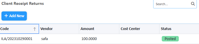 This page allows you to manage the process of returning amounts received from clients, you can create and record details of receipt returns, view the details of returned receipts, and organize them.