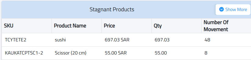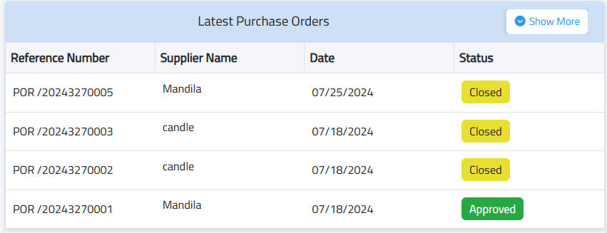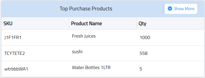 In the Dashboard you can view important insights such as the top purchase products, stagnant products, and the latest purchase orders.
