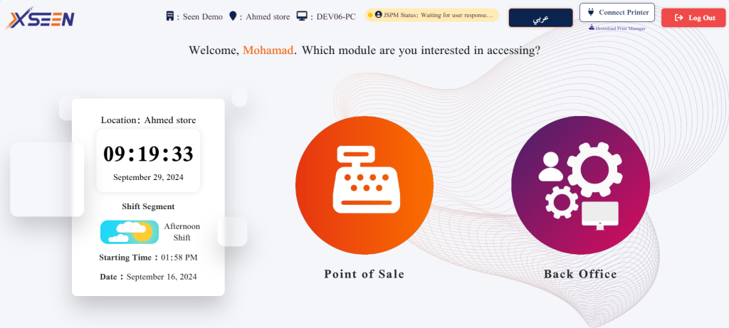 - At the top of the page, you’ll find the company’s name, location, Device name, language switcher, printer connection status, and a logout button.