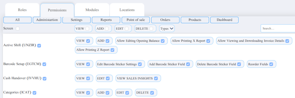 This page facilitates the assignment of the point-of-sale billing permissions to roles.