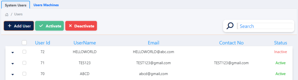 Click on the checkbox to Activate or Deactivate the user. The status of the user will change