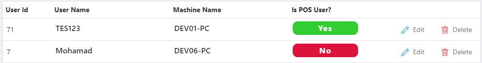 This tab allows the first registered user to automatically have one machine assigned. For the remaining machines, each can be assigned to one system user. POS users can be assigned to any machine without limitation.