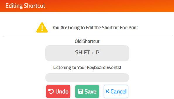 Press the keys to record them as the new shortcut, once the action is performed the system will show the new shortcut, confirm by clicking the save button or click on the undo button to try pressing the shortcut again.