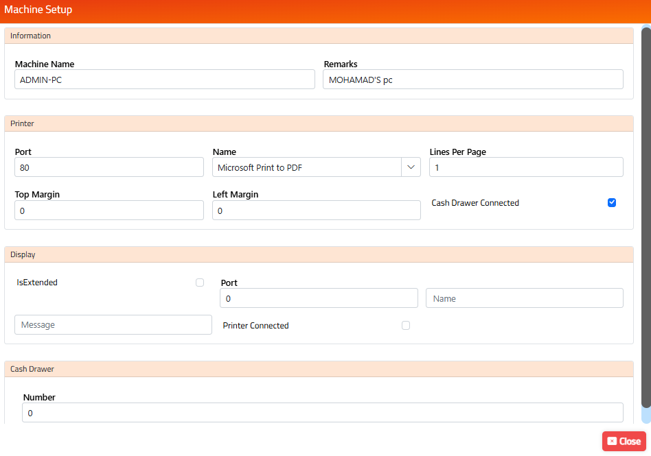 Printer: Enter the number of lines, the top margin, left margin in pixels, and select if the cash drawer is connected to the printer.