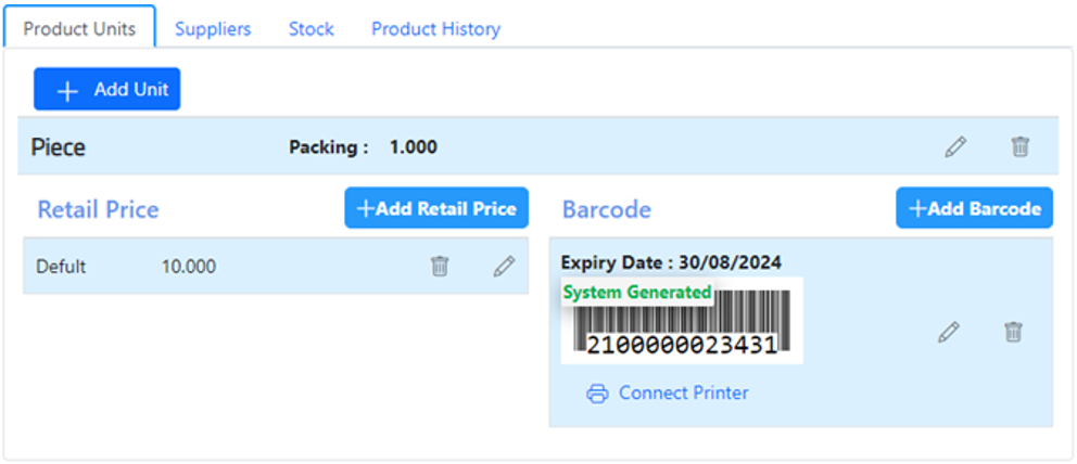 After selecting or adding a new unit, you can now add the barcode for the unit. Enter the retail price for the selected unit.