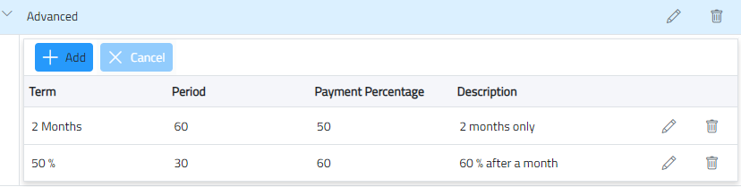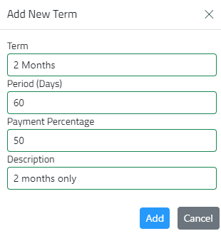 - Enter the terms name, duration in days, payment percentage, and description, then click Add. Editing Terms/Template