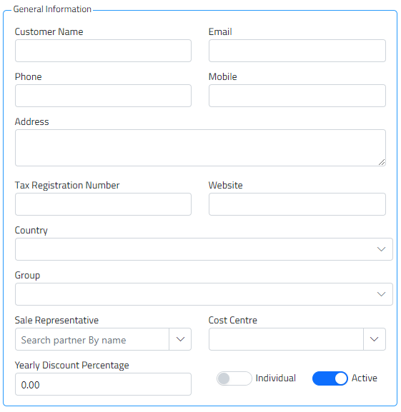 - Enter general customer information: name, email address, phone number, address, website, and tax registration number, among others.
