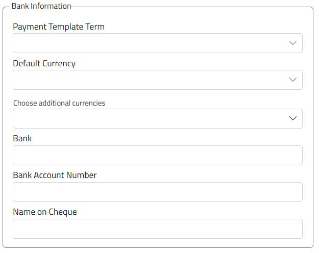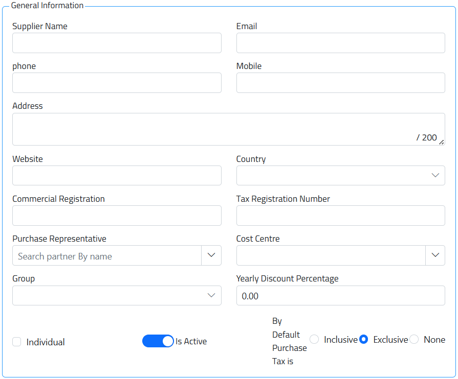 - Enter general supplier information: name, email address, phone number, address, website, and tax registration number, among others.
