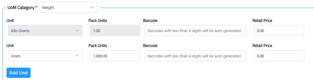 After selecting or adding a new unit, you can now add the barcode for the unit. Enter the retail price for the selected unit.