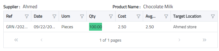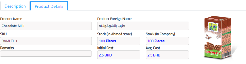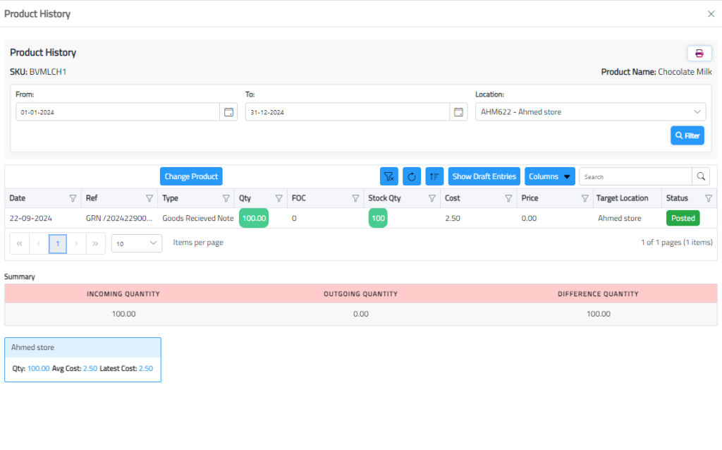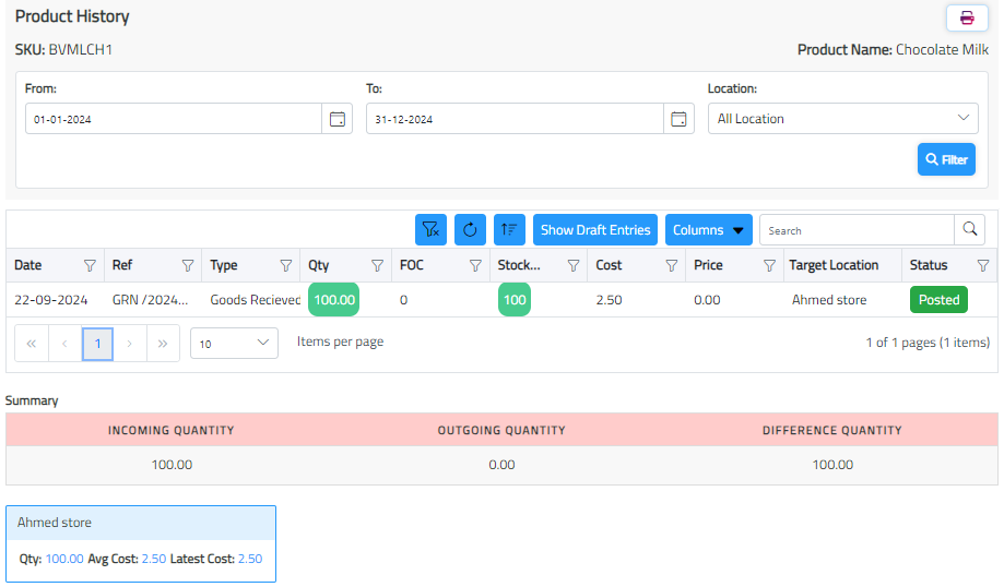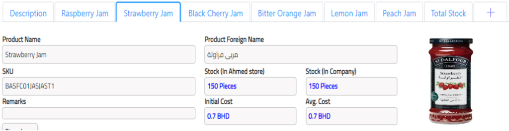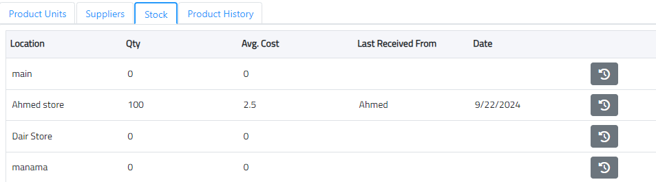 This tab keeps track of all the current stock information of the product in the various locations under the company, their Average cost, the received from, Date, and their history.