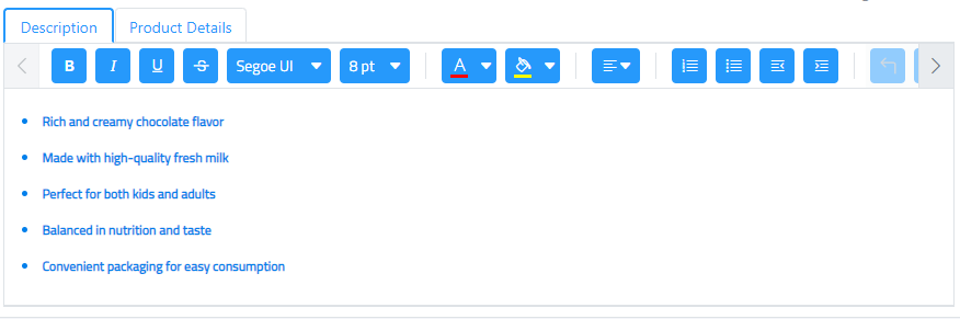 - Description Tab: This section is used for product descriptions that will appear on your e-commerce website.