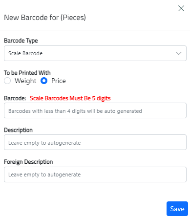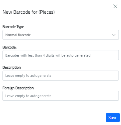 The user can enter a specific value for the barcode, description in the main language of the company, foreign description in the foreign language of the company, or leave them blank for the system to generate them.