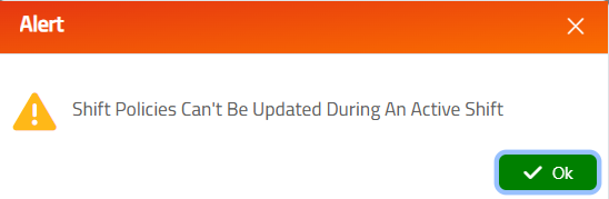 Note: if the shift is active for the location, the policies cannot be enabled/ disabled unless the shift is closed and thus the system shows the following alert messages when the user tries to save the changes.