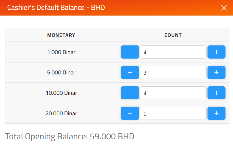 - If the Funds Reconciliation Based on Currency Denominations is disabled, then the user must enter the default Opening Balance for Cashiers in Native Currency.