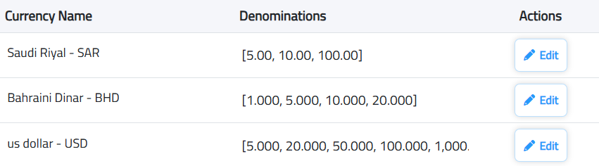 Note: The currency denominations can be added to the new currencies that don’t have a denomination or the existing denominations can be edited by clicking on the edit button.