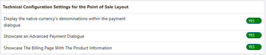 When the policy is enabled, the system provides an enhanced payment dialogue that includes several features. These features include displaying the accepted input amount in foreign currencies, the accepted payment types, a comprehensive record of all payment transactions, as well as the paid and unpaid balance.