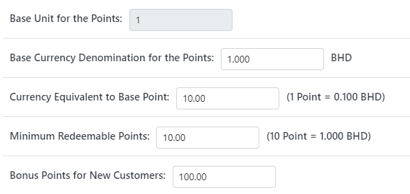 – This defines the starting bonus points for new customers. If 10 bonus points are set, a new customer will receive 1 BHD worth of points (10 points = 1 BHD) during their first transaction.