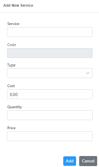 Enter the name of the service, choose the type of service (The user has created on the service type page), and add the cost of the service, quantity, price, and account that will be affected and click the add button.