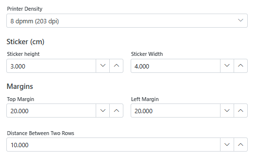 Select the printer Density, Sticker height, and width in cm, the Top margin, and left margin in dpmm, and the distance between 2 rows.
