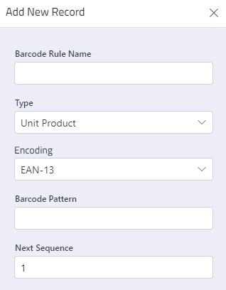 Barcode rules can be created here by Entering the rule name, Type, Encoding rule, Barcode pattern And Next Sequence.