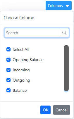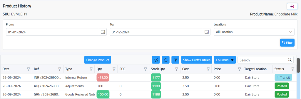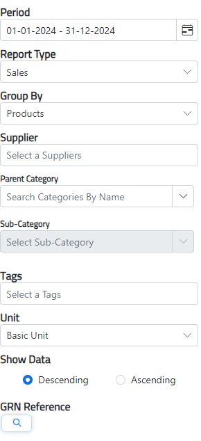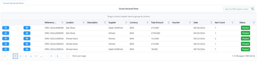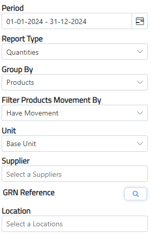 - GRN Reference: Click on search button to select by GRN references to track specific transactions.