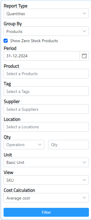 - Report Type: Quantities: Shows only stock quantities / Quantities and Cost: Displays both quantities and costs.