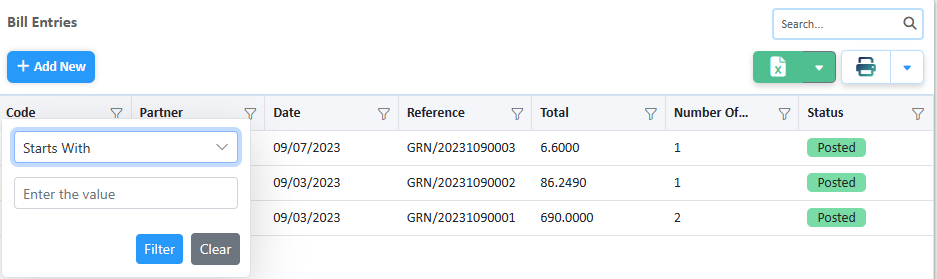 Filtering: Click on the filter icon to open the filter and enter the value to filter for or use the search bar to find the desired record.