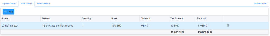 - Click the add button to add an expense, asset and service record.