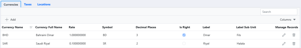 Note: The currency denominations can be added to the new currencies that don’t have a denomination or the existing denominations can be edited by clicking on the edit button.