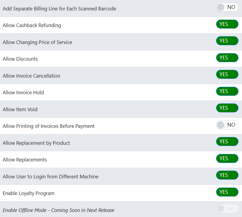 Note: This excludes Offline Mode and Update Inventory Stock, which are enabled by default.