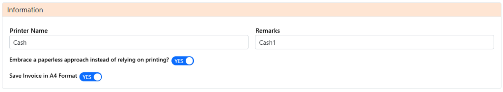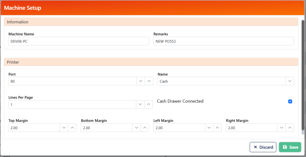 Printer: Enter the port number, lines per page, select name of the printer and select if the cash drawer is connected to the printer.