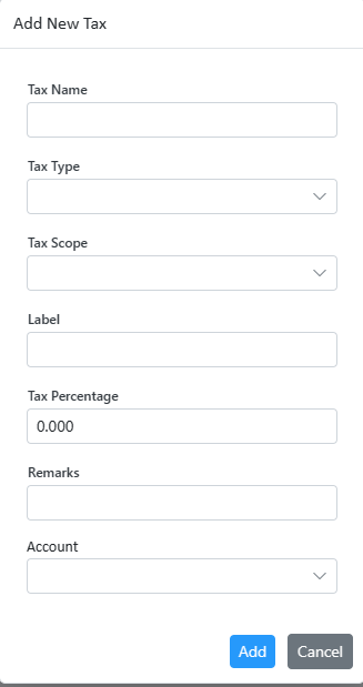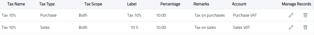 Taxes that the user added first when creating the company will show here, the user can edit by double-clicking on the record, delete the existing taxes, or create new taxes.