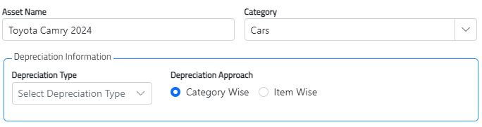 Enter the Asset name, select the category of the asset, choose depreciation type and depreciation approach.