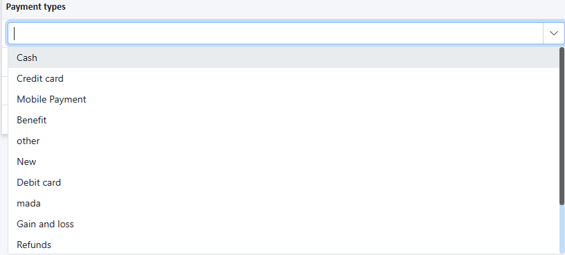 Then the system will display the payment types for the selected cost center.