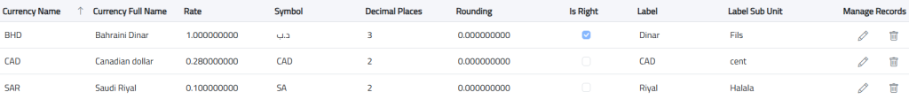The currencies page lists all available currencies with details like names and symbols. You can easily add multiple currencies to the system, enabling you to manage transactions in different currencies as needed, currencies are used in the supplier page, customer page and all over the system, if the value for currency is not selected then the main currency from the company will be taken as default.