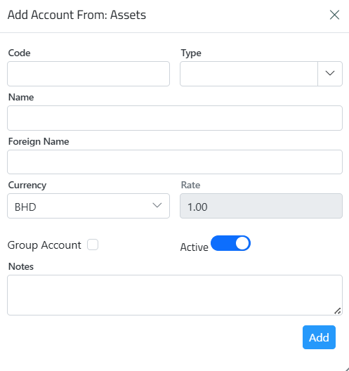Write the code, select the account type, write the name and foreign name select the currency,