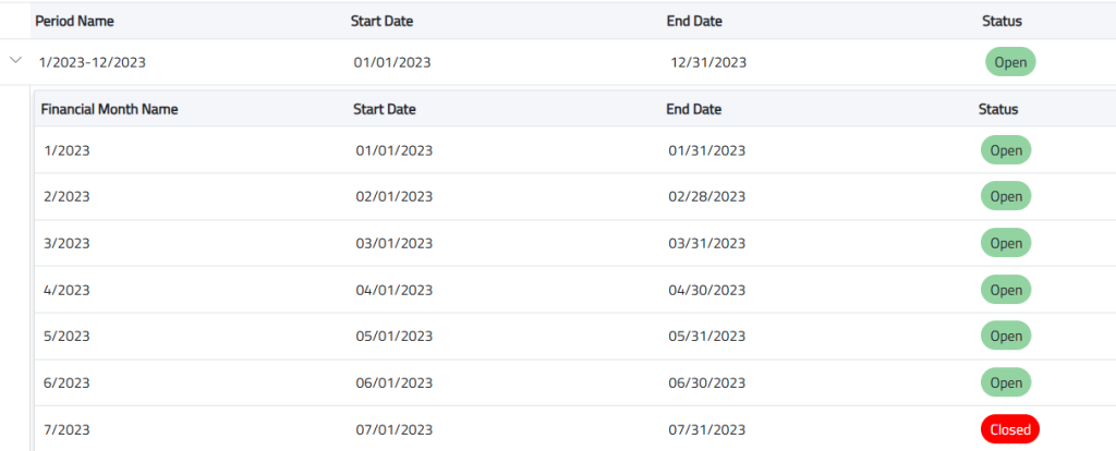Choose start/ end date, The system shows all 12 months with their start and end dates and the status if they are open or closed.