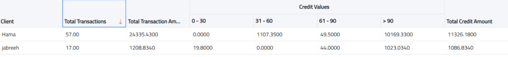 The client statement page displays a list of all clients with their associated debits, credits, and balances. To view detailed information for a specific client, double-click on their name in the list. This will open a detailed view of that client’s account, showing their transaction history and account status.