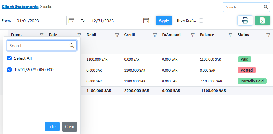 To export the Client Aging Statement in PDF format, click on the “Print” button.