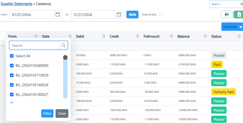 To export the supplier Aging Statement in PDF format, click on the “Print” button.