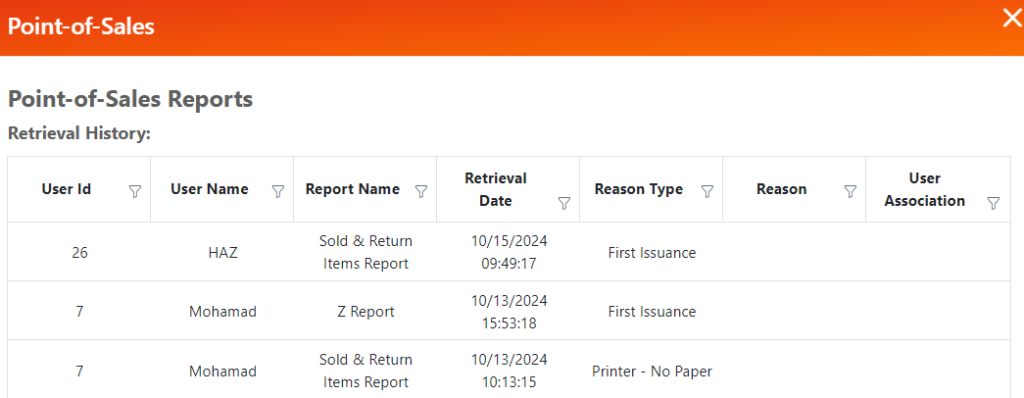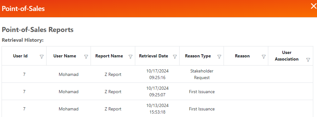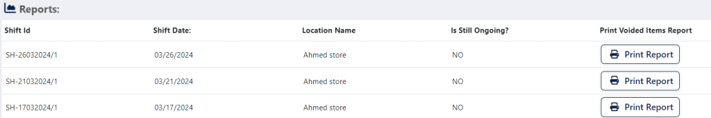 This report allows users to view and download detailed sales reports, categorized by shifts and their associated users