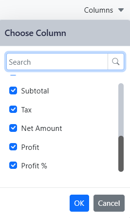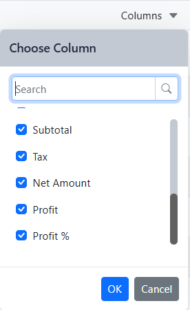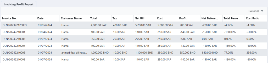 This report displays the invoice number, all customers, total invoice amount, total tax, and any discounts applied to the invoice. It also includes calculated profit and cost ratios.
