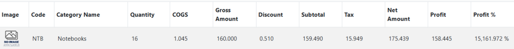 This report displays the category name, cost, quantity, cost of good sold, gross Amount and profit percentage.