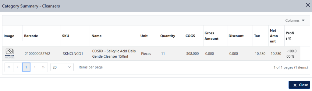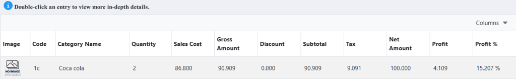 This report displays the product name, cost, quantity, cost of good sold, gross amount and profit percentage.