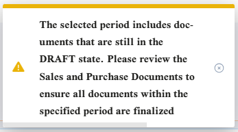 3- You cannot select a period that includes documents with DRAFT status. Please review the Sales and Purchase Documents to ensure all are finalized before proceeding.