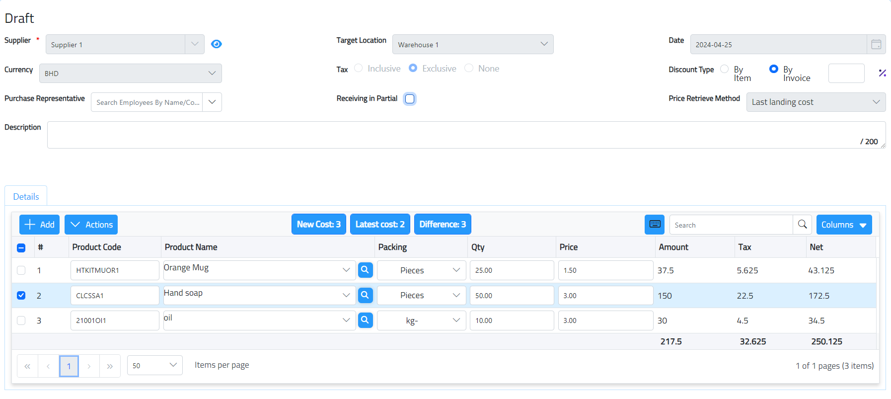 You can issue purchase orders by selecting predefined suppliers, location, currency, applicable taxes, and discount type, in addition to assigning the responsible purchasing agent. To improve inventory management, the system offers the option to receive order quantities in batches and easily calculate costs. Use the description field to provide additional information about each purchase order, enhancing the understanding and tracking of orders accurately. Our system is designed to give you complete and comprehensive control over purchasing operations, contributing to improved supply management and increased operational efficiency.